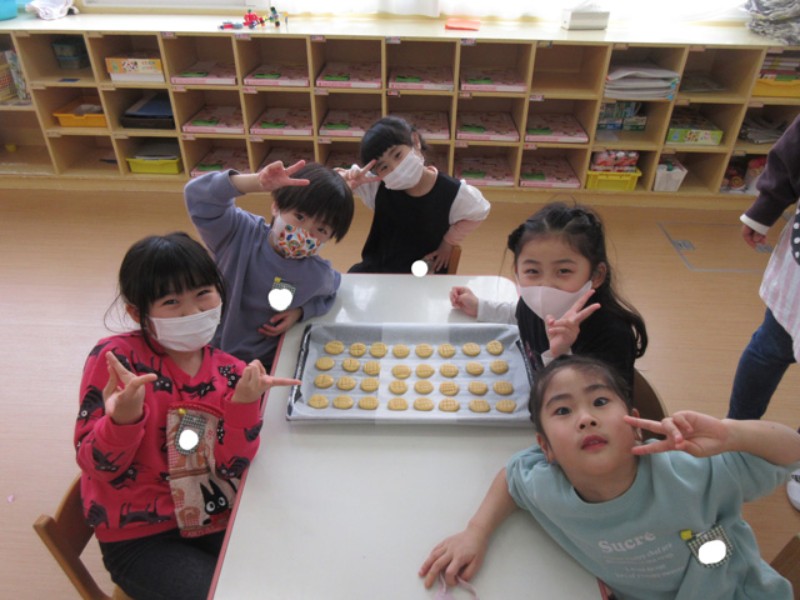 栄養士の話を聞き、早速やってみると…自分達で順番を決めながら黙々と進めていました。たまに「あれ?カタカナのキになった」と自分が想像していた模様と違っても、そこが面白かったようで、特に気にすることなく(笑)あっというまに完成!焼き上がりが待ち遠しそうでした。